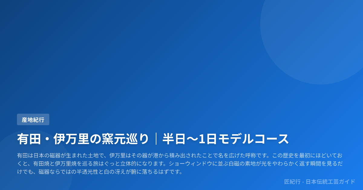 皿山通りから泉山、大川内山へと徒歩でつなぐ歩き方を軸に、柿右衛門・今右衛門・古伊万里・鍋島の見分けどころや、高台・裏文様の観察ポイント、ろくろ体験や陶器市の回り方まで、産地歩きに必要な情報を一つにしたガイドです。