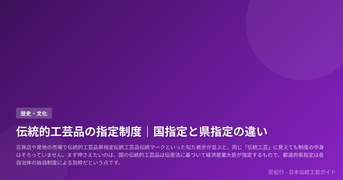 まず押さえたいのは、国の伝統的工芸品は伝産法に基づいて経済産業大臣が指定するもので、都道府県指定は各自治体の独自制度による別枠だという点です。