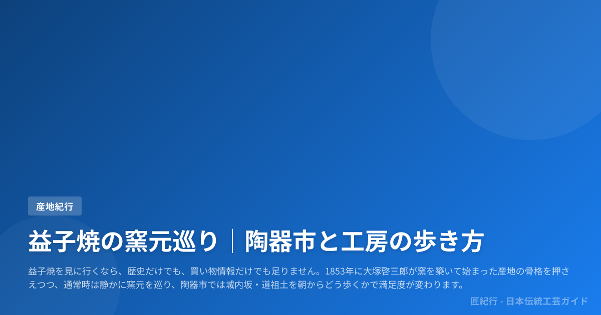 1853年に大塚啓三郎が窯を築いて始まった産地の骨格を押さえつつ、通常時は静かに窯元を巡り、陶器市では城内坂・道祖土を朝からどう歩くかで満足度が変わります。