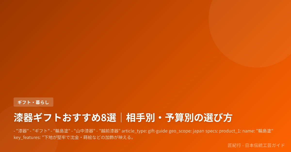 • "越前漆器" article_type: gift-guide geo_scope: japan specs: product_1: name: "輪島塗" key_features: "下地が堅牢で沈金・蒔絵などの加飾が映える。記念性の高い贈答向き" product_2: name: "山中漆器" key_features: "木地挽きの技術に強み。薄手で軽く、毎日使う椀やカップ向き" product_3: name: "越前漆器" key_features: "実用品としての展開が広く、現代の暮らしに合わせた選択肢が多い" product_4: name: "紀州漆器" key_features: "比較的取り入れやすい価格帯も見つけやすく、入門ギフトに向く" product_5: name: "会津塗" key_features: "蒔絵など装飾性があり、華やかさを重視する贈り物向き"